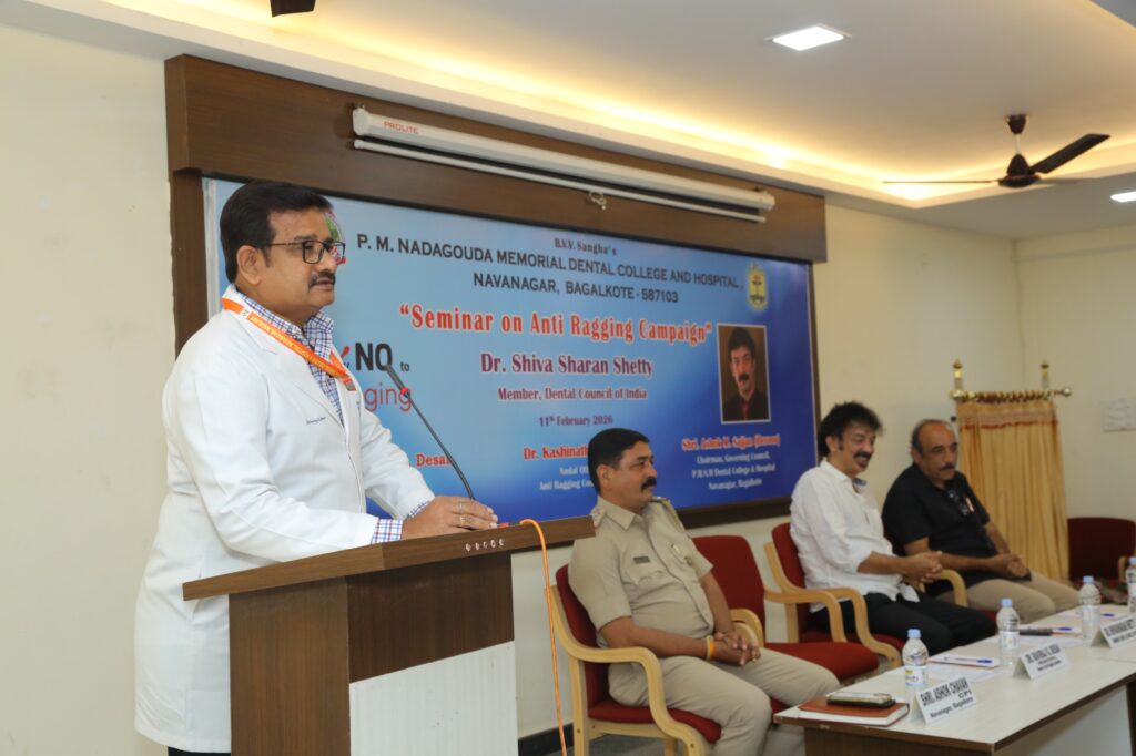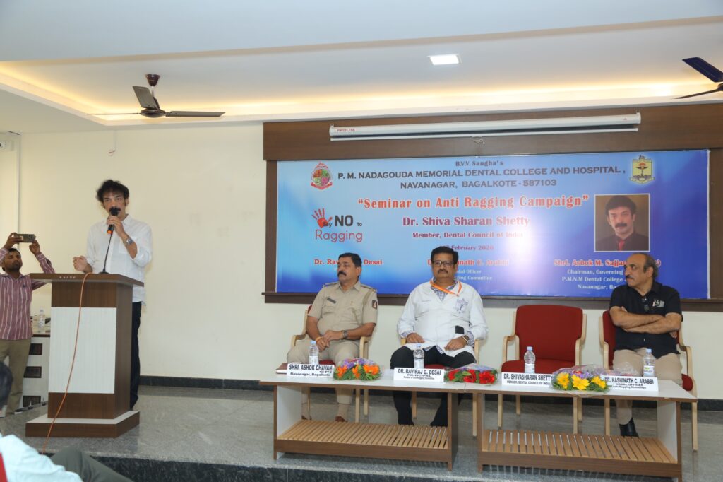 The seminar on Anti Ragging campaign/ workshop was held on 11th February 2026 at 03.30 p.m. Venue: PMNM Dental College Auditorium hall. Dr. Raviraj G. Desai, Principal welcomed the Chief Guest and members of Anti Ragging committee for the workshop. The introduction of the Chief Guest was done by Dr. Siddhram Patil, Reader, Department of Prosthodontics. Chief Guest Dr. Shiva Sharan Shetty, Member, Dental Council of India, New Delhi., addressed the gathering regarding the awareness of Anti Ragging campaign/ workshop. Shri. Ashok Chawan CPI, Navanagar, Bagalkote, Dr. Kashinath C. Arabbi, Nodal Officer (Anti Ragging) and all the Anti Ragging committee members, Fresher’s and Senior Students attended the workshop. The workshop was concluded with the vote of thanks by Dr. Nivedita C B, Reader, Department of Public Health Dentistry.