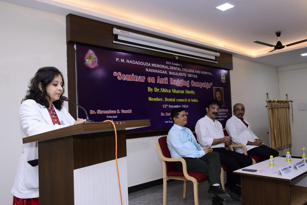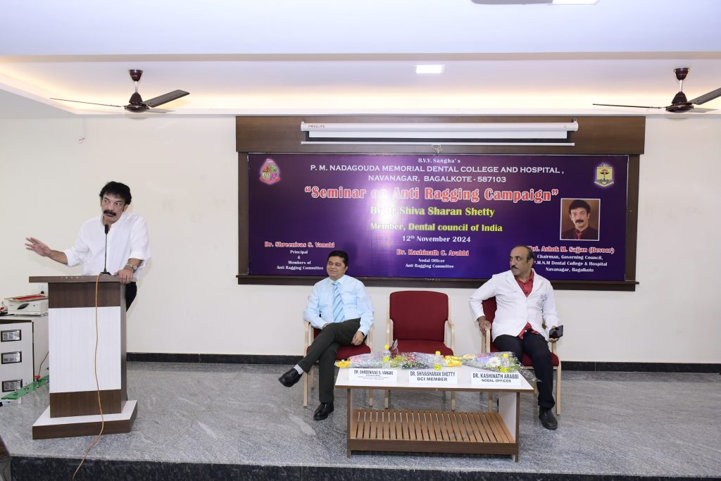 On November 12, 2024, an anti-ragging session was organized at the institution. Distinguished speaker Dr. Shivasharan Shetty, a member of the DCI, Dr. Shreenivas S. Vanaki, Principal of the college and Dr. Kashinath Arabbi, Professor in the department of Prosthodontics and the Nodal Officer of the anti-ragging committee, inaugurated the event. Dr. Shivasharan Shetty, who chaired over the occasion, gave a thorough presentation on the institutional policy against anti ragging and the steps being taken by law enforcement to address it. All members of the squad, the anti-ragging committee, UG and PG students, and both teaching and non-teaching staff were present.