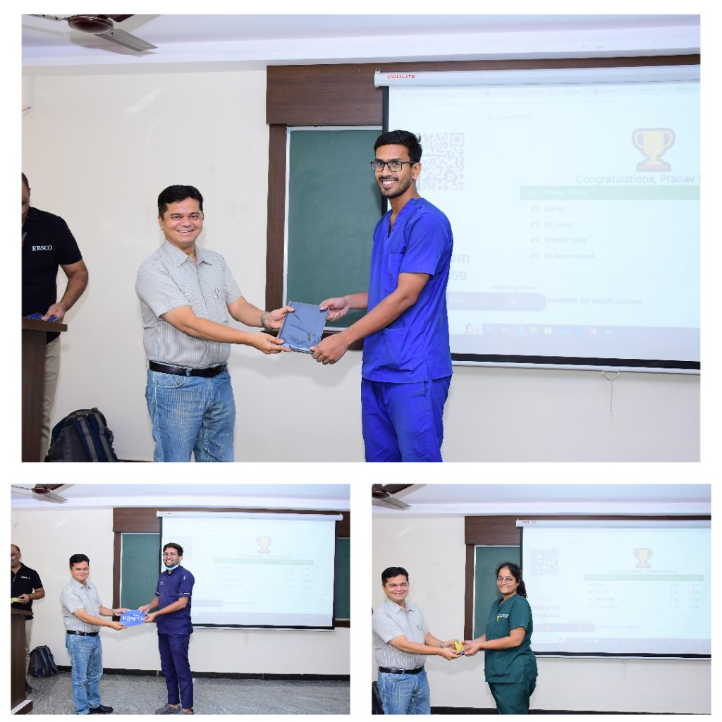 LIBRARY: “EBSCO Database’s training program” May 29, 2025April 9, 2025 Mr. Gourav Vinayak Date is a training manager of EBSCO Database, conducted EBSCO Database training program to all the faculty and PG students in the collaboration of RGUHS HELINET Consortium on 7th April 2025. The prize winners of this event.